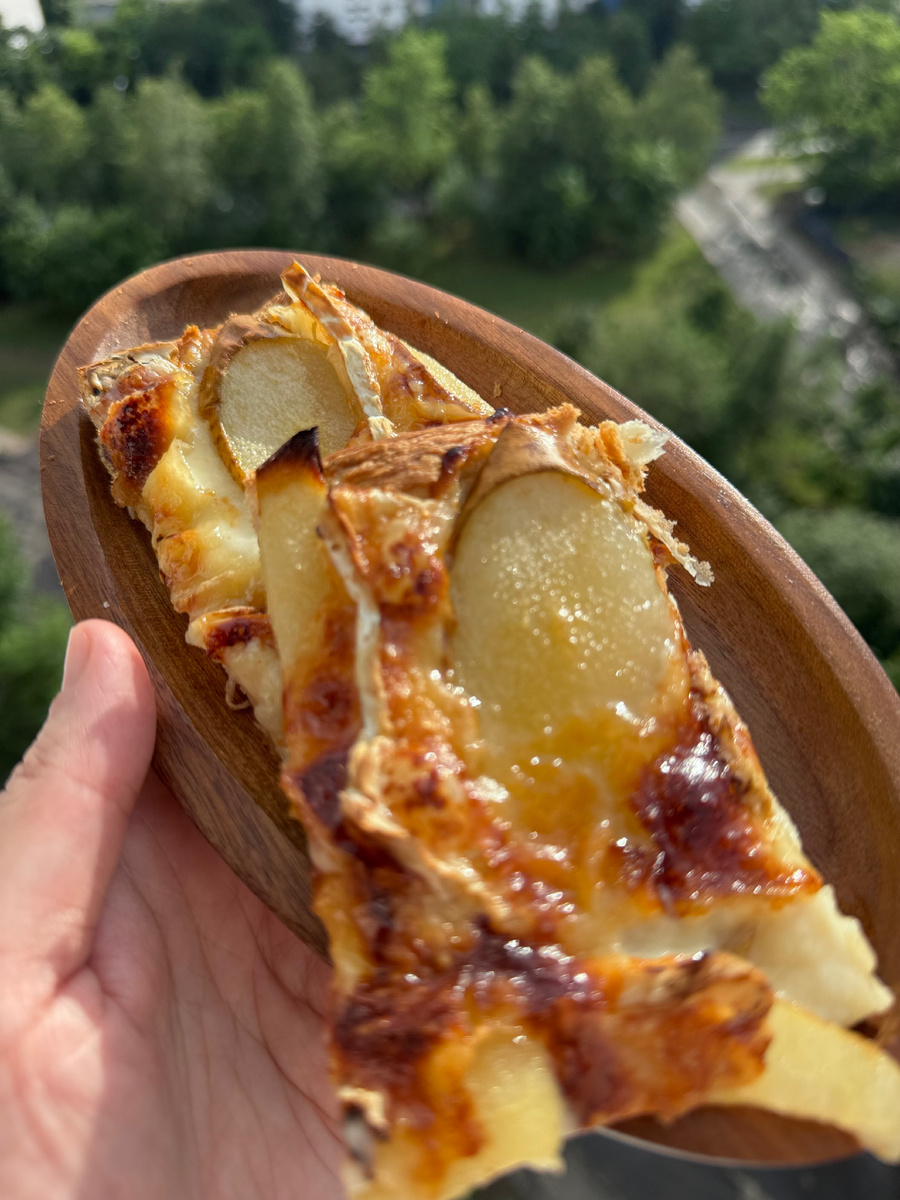 Это таааааак вкусно!!! Я давно видела подобные рецепты, но вчера звезды сошлись! Не хватало теста, кажется сдобное дрожжевое взяла. Раскатала пласт примерно размером 20*25 и по очереди положила камамбер и грушу. Сверху 1-2 ч.л. Сахара для цвета. И на полчаса в духовку. Бомба!