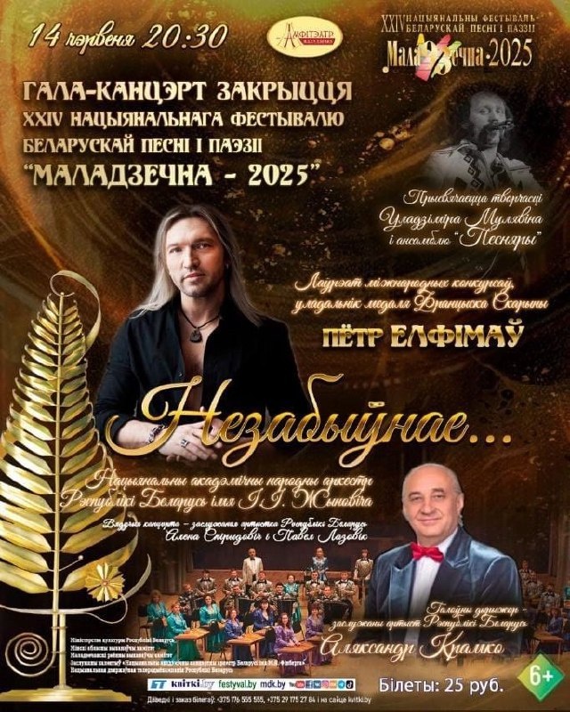 13 и 14 июня в городе Молодечно Минской области Республики Беларусь состоится XXIV Национальный фестиваль белорусской песни и поэзии «Мала93ечна–2025». На протяжении двух фестивальных дней пройдёт несколько десятков мероприятий, которые в полной мере продемонстрируют, насколько богаты история и традиции Беларуси. Будут показаны лучшие достижения в сфере культуры страны. 14 июня Пётр выступит в летнем амфитеатре города на гала-концерте закрытия фестиваля с концертной программой «Незабываемое...», посвящённой творчеству Владимира Мулявина и ансамблю «Песняры», в сопровождении Национального академического народного оркестра Республики Беларусь имени И.И. Жиновича (главный дирижёр - заслуженный артист Республики Беларусь Александр Кремко). Ведущие концерта - заслуженная артистка Республики Беларусь Елена Спиридович и Павел Лазовик. 📌 Летний амфитеатр, г. Молодечно (Республика Беларусь, Минская обл., г. Молодечно, Центральная площадь, д. 4); 📌 14 июня в 20:30. Билеты можно приобрести п