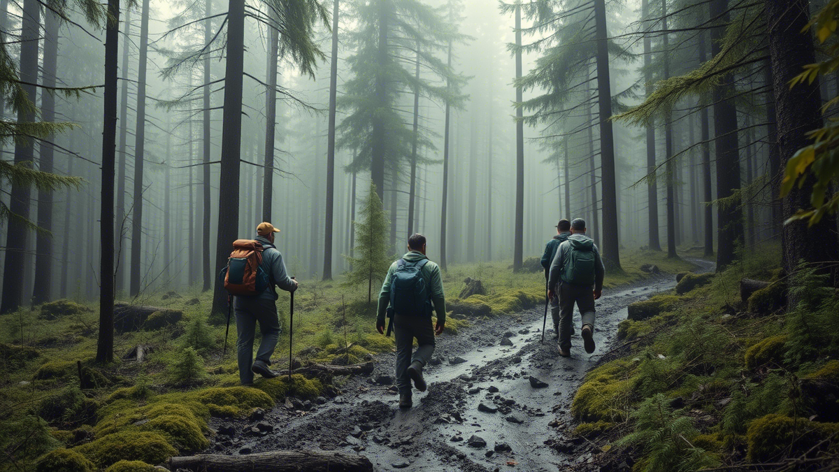 Небольшой отряд геологов пробирался по таёжному маршруту, шаг за шагом преодолевая густые заросли. Четверо усталых путников, согнувшихся под тяжестью рюкзаков, двигались словно механизмы, безмолвно следуя по узким, извилистым тропинкам. Их взгляды, уставшие и отрешённые, были прикованы к мелькающим пяткам впереди идущего, и лишь изредка руки их автоматически поднимались, отгоняя назойливую мошкару.
