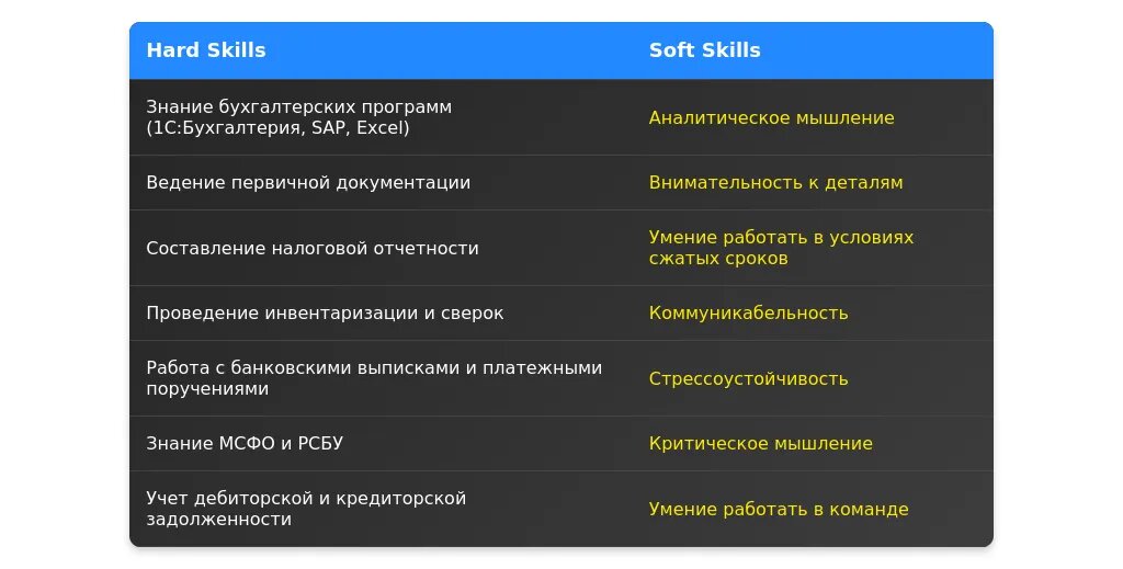 Акцент на качества и навыки: внимательность, усидчивость, знание основ бухгалтерии, владение программами (1С, Excel).