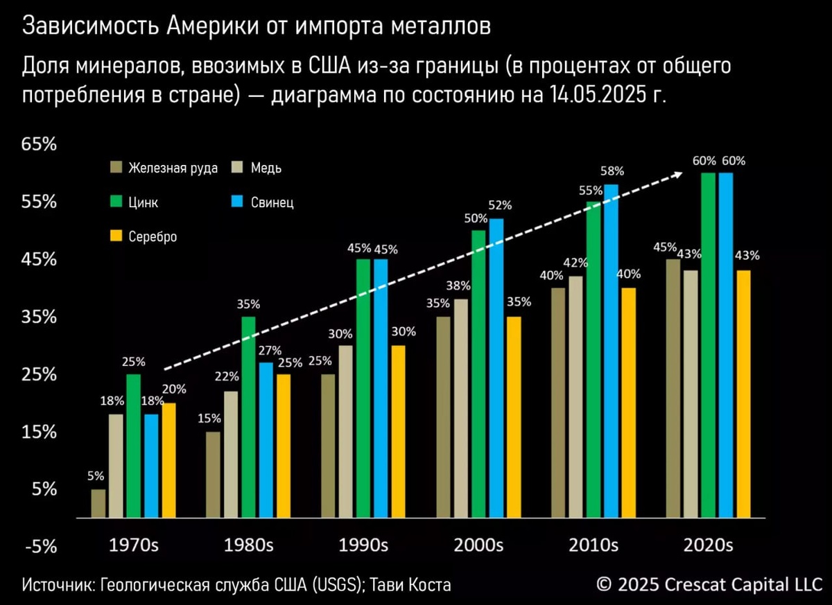 В начале XX века США полностью покрывали свои потребности в металлах, но к 2025 году ситуация кардинально изменилась. Страна импортирует 65% цинка, 55% серебра, значительные объёмы меди и других металлов.