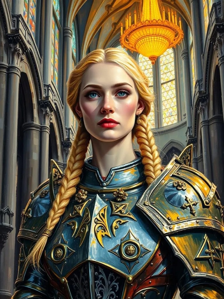 An expressive oil painting in the vibrant and textured style of Vincent Van Gogh, portraying a resplendent queen warrior in a grand cathedral. Her braided blonde hair is painted with thick, luminous strokes. She wears magnificent silver and gold armor, rendered with bold, textured impasto strokes that shimmer with reflected light, highlighting its incredibly ornate details. Her expression is regal and serene. The background is the awe-inspiring interior of a cathedral, with towering columns and vaulted ceilings painted with energetic, swirling strokes of stone greys, browns, and golds. Light streams through stained-glass windows, rendered as vibrant dabs and streaks of color. Ornate chandeliers glow with thick dabs of yellow and orange paint. The lighting is divine and dramatic, imbuing the scene with a sense of sacred grandeur and pulsating, spiritual energy. #neuroart #нейроарт #ai #ии #нейросеть #картинки #искусственныйинтеллект #цифровоеискусство #digitalart #арт #art #prompt #про
