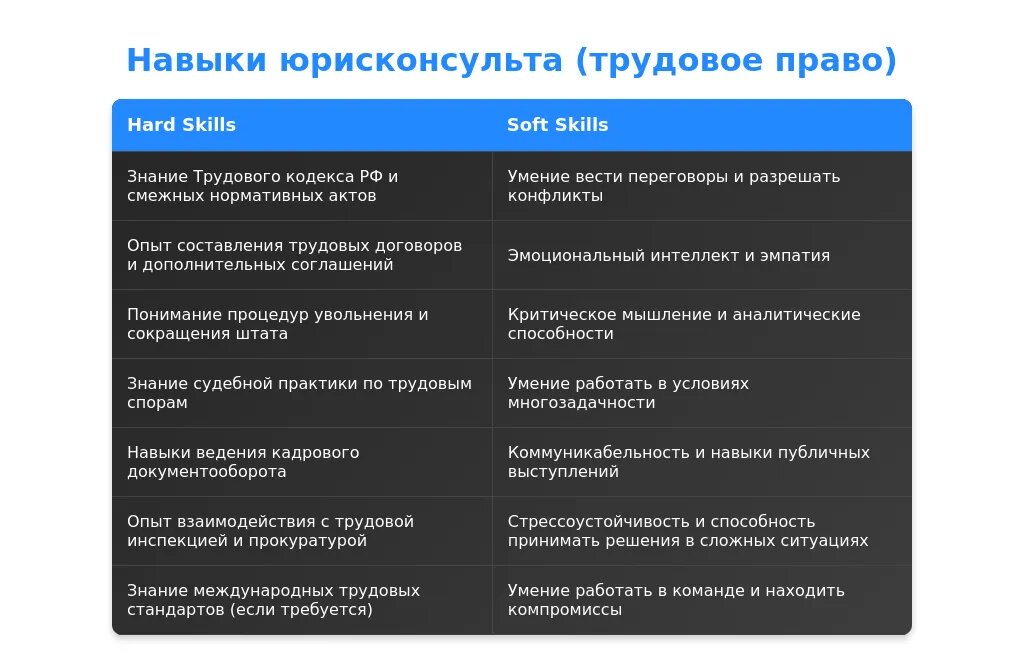При анализе вакансии для должности юрисконсульта по трудовому праву важно выделить ключевые требования, разделив их на обязательные и желательные. Обязательные требования обычно включают наличие высшего юридического образования, опыт работы в трудовом праве, знание трудового кодекса и судебной практики. Желательные требования могут включать знание иностранного языка, опыт работы в международных компаниях или знание специфических отраслей, таких как IT или производство.