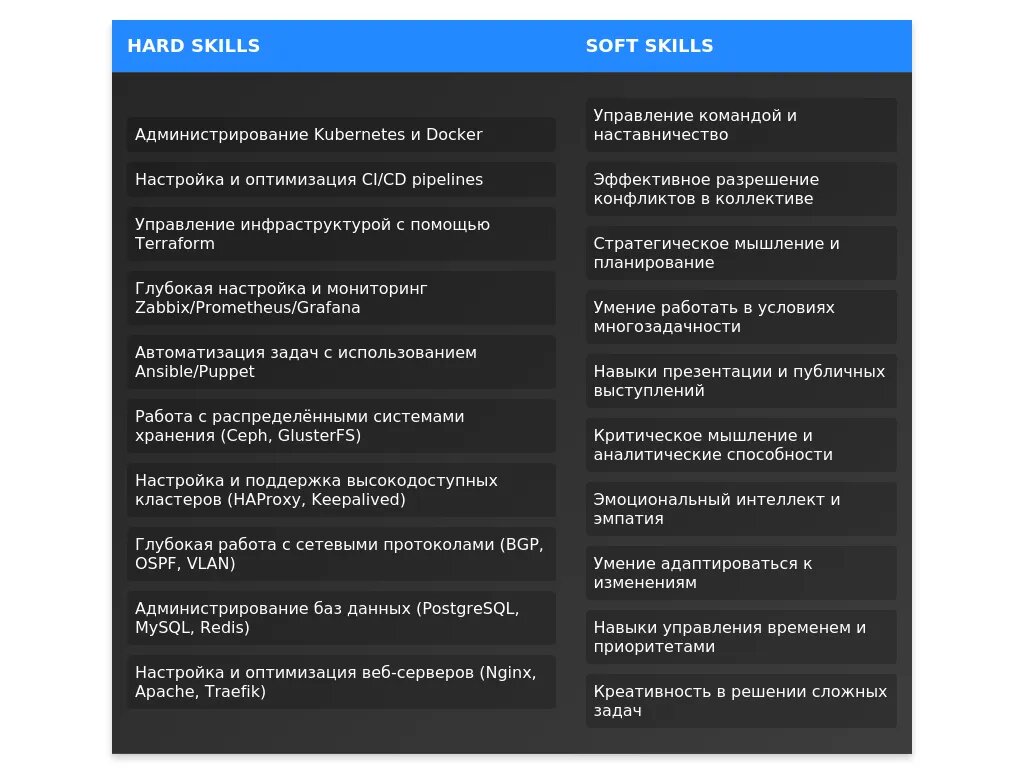 После адаптации: "Linux (Red Hat, CentOS), Windows Server, сети (TCP/IP, DNS, DHCP), базы данных (MySQL, PostgreSQL), автоматизация (Ansible, Puppet)."