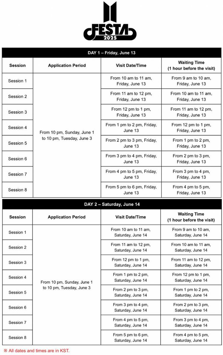 🍀 Обновление Weverse: Гид по участию в фан-зоне Army Zone на 2025 BTS Festa. Здравствуйте. Это официальное уведомление от фан-клуба BTS. Фан-зона Army Zone будет доступна только для обладателей подписки Army Membership (GL/JP/US) по предварительной заявке и лотерейному отбору. Основная информация: • Место: Kintex 2, зал 9, Ильсан, Южная Корея • Даты и время: 13 июня 2025 (пятница), 04:00–12:00 по мск 14 июня 2025 (суббота), 04:00–12:00 по мск • Подача заявки: С 1 июня (воскресенье) 16:00 до 3 июня (вторник) 16:00 по мск Можно выбрать до двух временных слотов, но выиграет только один. • Объявление победителей: После 11:00, 9 июня 2025 (понедельник), по мск времени • Участие: Только по лотерее. Победителям будет предоставлен подарочный набор (только один раз). #BTS 🦖🌸[https://dzen.ru/id/5f3ce54ccaeef80d2efd6e05]🌸🦖