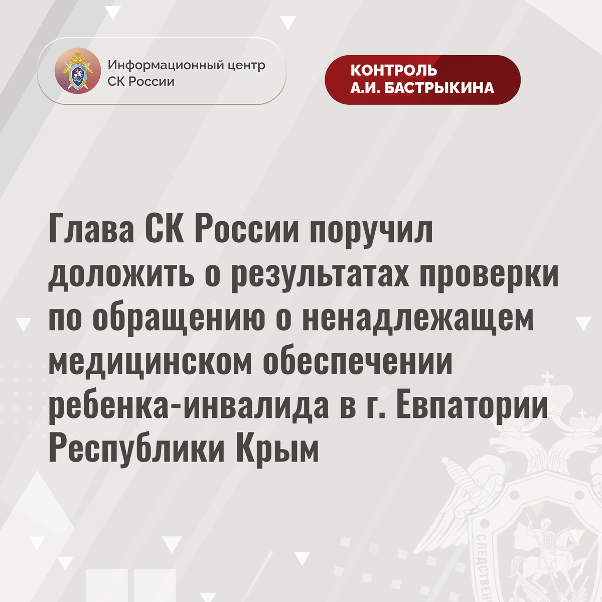 Глава СК России поручил доложить о результатах проверки по обращению о ненадлежащем медицинском обеспечении ребенка-инвалида в г. Евпатории