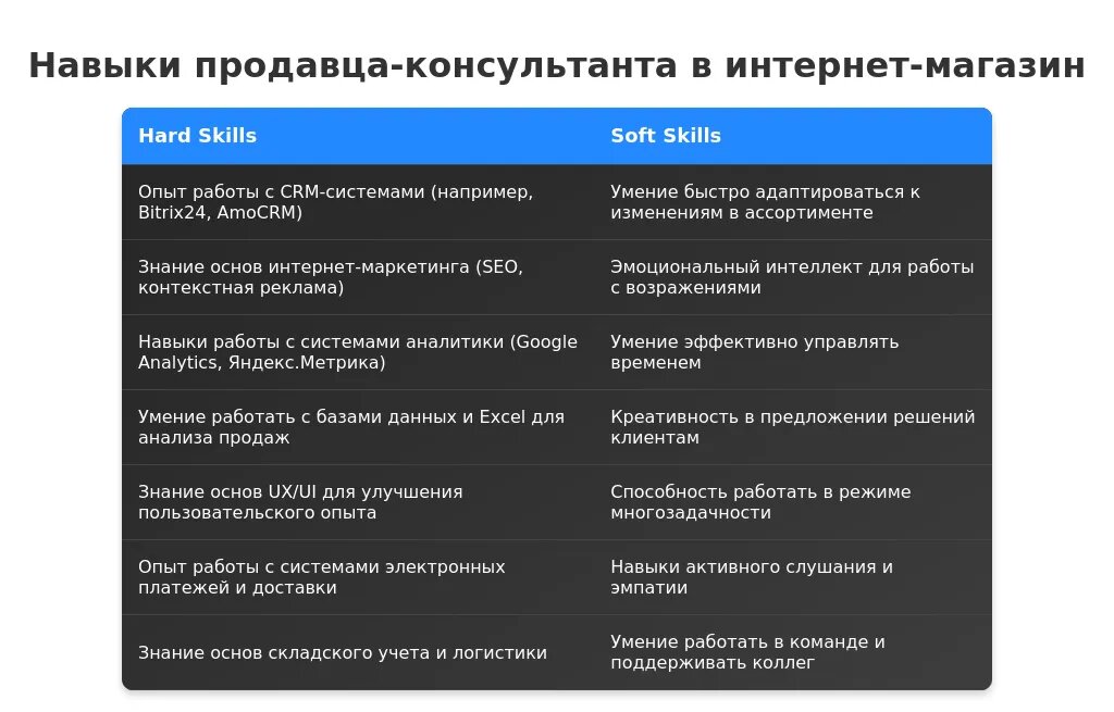 - Навыки продаж: "увеличение среднего чека", "рост конверсии", "работа с возражениями".