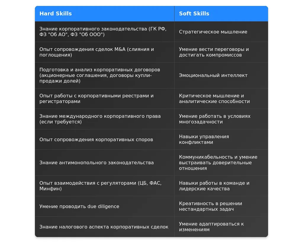 - Навыки для акцента: Базовые знания корпоративного права, навыки анализа документов.