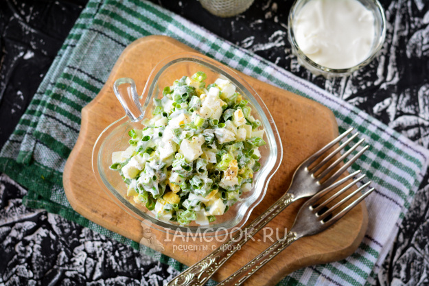 Быстрый, сытный, понятный – этот салат выручает всегда! Мы делаем его летом по несколько раз в неделю: в жару он не надоедает, готовится легко, продукты всегда под рукой. Можно есть сам по себе, а можно подать с отварным картофелем или чёрным хлебом, к мясу, рыбе. Готовится за 15 минут, и это максимум. В этом рецепте не может ничего не получиться. Кто пробует – добавляет в свой постоянный список. Полный список ингредиентов – в конце⤵ Берём 2 куриных яйца, заливаем водой и варим вкрутую – это 9–10 минут после закипания. Остужаем под холодной водой и чистим. Нарезаем яйца кубиками или как удобно – лишь бы не в кашу. Промываем пучок зелёного лука (7–10 г – это примерно 2–3 стрелки), обсушиваем и режем мелко. Больше фото смотрите тут: Складываем всё в миску, солим и перчим по вкусу. Не бойтесь добавить чуть больше лука – он не перебивает, а подчёркивает яйца. Заправляем 2 столовыми ложками сметаны – жирность любая. Перемешиваем. Сразу подаём. Если остался – хранится в холодильнике под