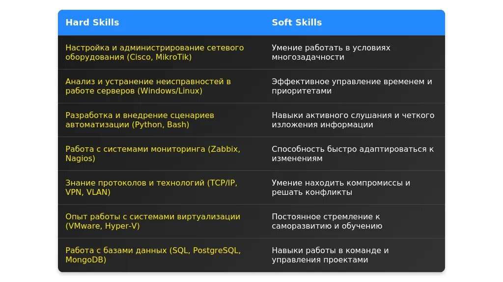 После адаптации: "Навыки работы с базами данных (SQL, Oracle), программирование на Python, управление командой, внедрение ITIL-процессов."