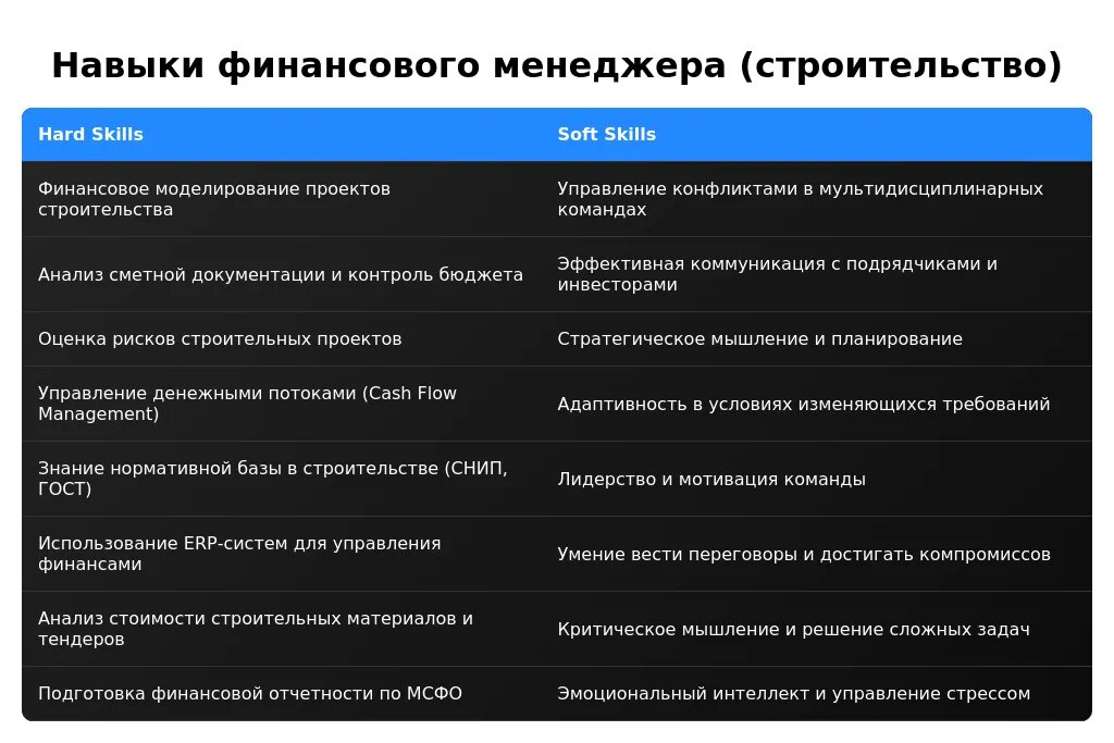 После адаптации: "Навыки управления бюджетами строительных проектов, знание стандартов IFRS, опыт работы с MS Project".