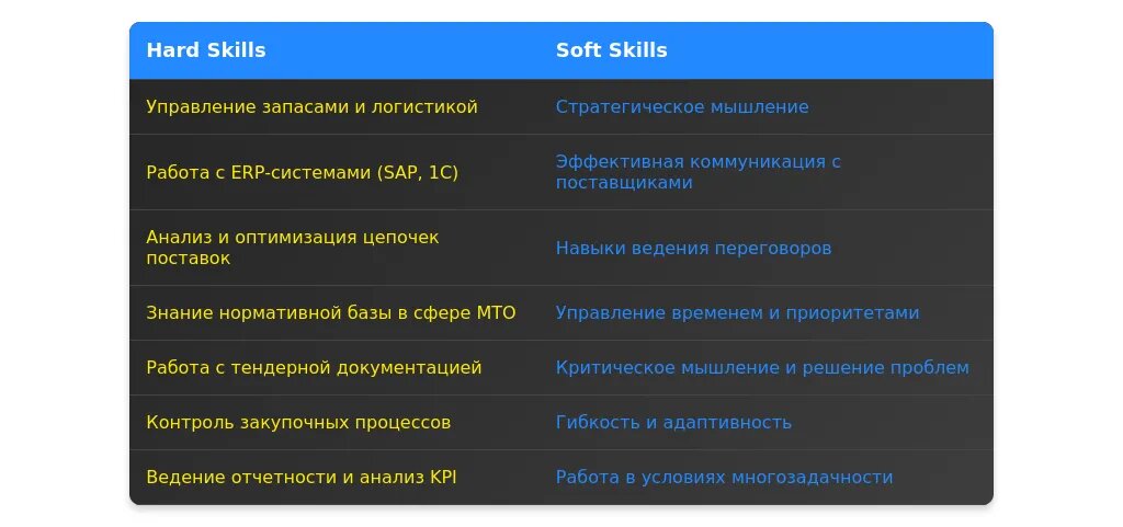 Навыки должны быть перегруппированы в соответствии с требованиями вакансии. Выделите ключевые компетенции, такие как "работа с ERP-системами" или "управление закупками". Используйте ключевые слова из описания вакансии, чтобы резюме прошло автоматический отбор.