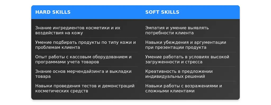 - Профессиональные навыки (например, знание косметических брендов, техники продаж).