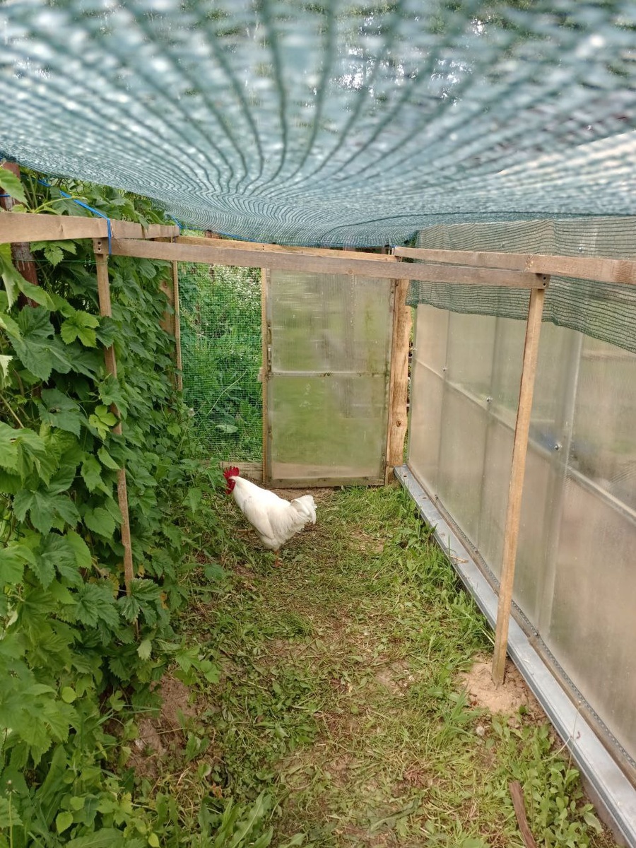Благодаря не дорогим технологиям из Поднебесной — довольно быстро затенил и огородил каркас временного размещения пернатых. Верёвки да клипсы. И крепления держатся хорошо. Это место за теплицой, пока новый курятник не доделаю тут Сёпка со своими курами побудут. Чтоб в ангаре от жары яйценоскость не теряли.