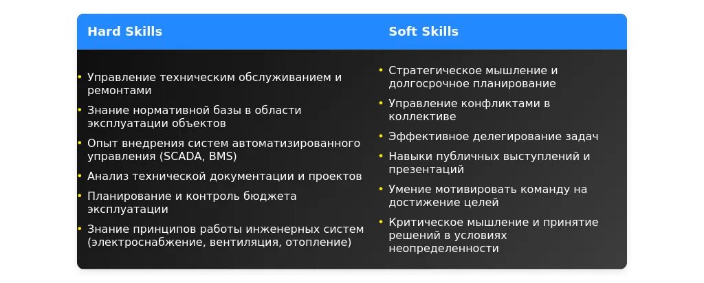 После адаптации: "Знание нормативной базы, управление командой, работа с подрядчиками, внедрение систем автоматизации."