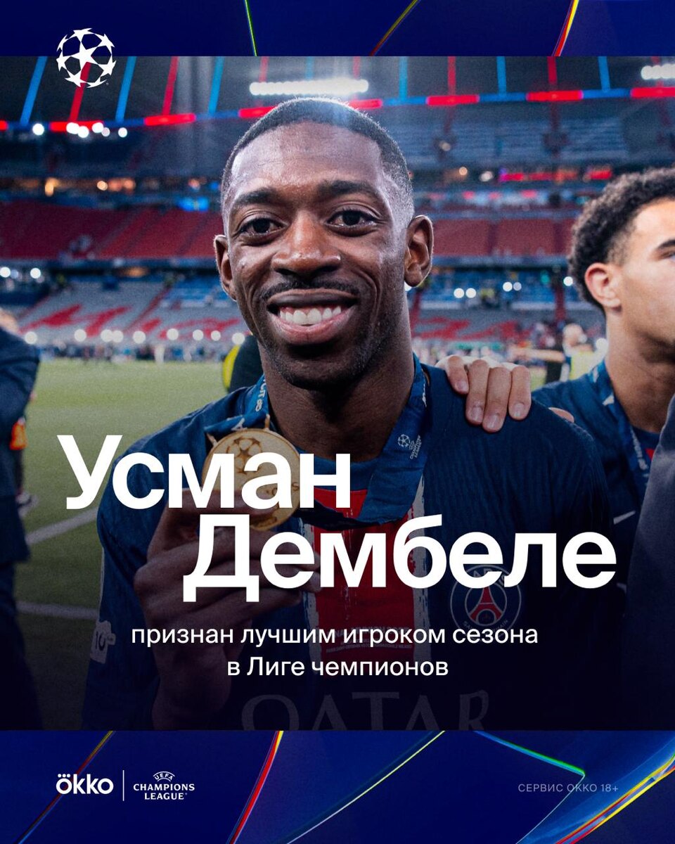 Дембеле — MVP сезона в ЛЧ. Теперь официально 🏆 Усман забил 8 голов и отдал 6 ассистов в 15 матчах. А героя финала Дезире Дуэ признали лучшим молодым игроком сезона-2024/25. Все по фактам. 👏 — высочайший уровень