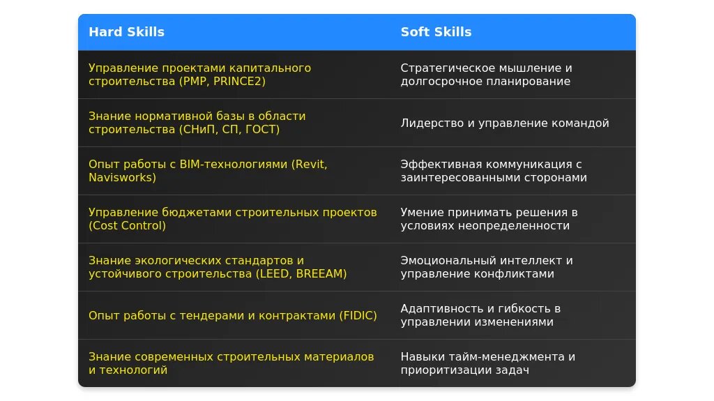 До адаптации: "Знание строительных норм, управление проектами, работа с подрядчиками."