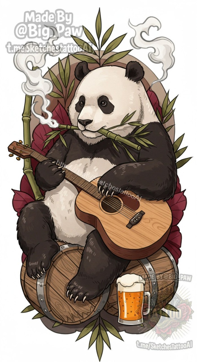 #2479 Подборка по запросу подписчика - эскиз в неотраде На ногу, на икру. Панда облокотившись на бочки с пивом, курит бамбук. На бочках ещё гитара. 🧠 SYNTX 💳 Донат 😎 НейроБро 😎 Эскизы без вотера 💀 Эскизы от нейросети #неотрад #панда #наикру #эскизы #тату #татуировки
