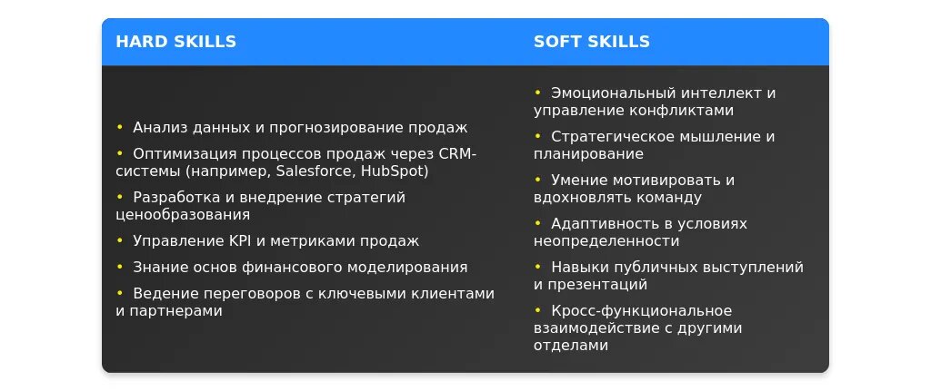 Удачный пример: "Навыки ведения переговоров, управление KPI, анализ рынка."