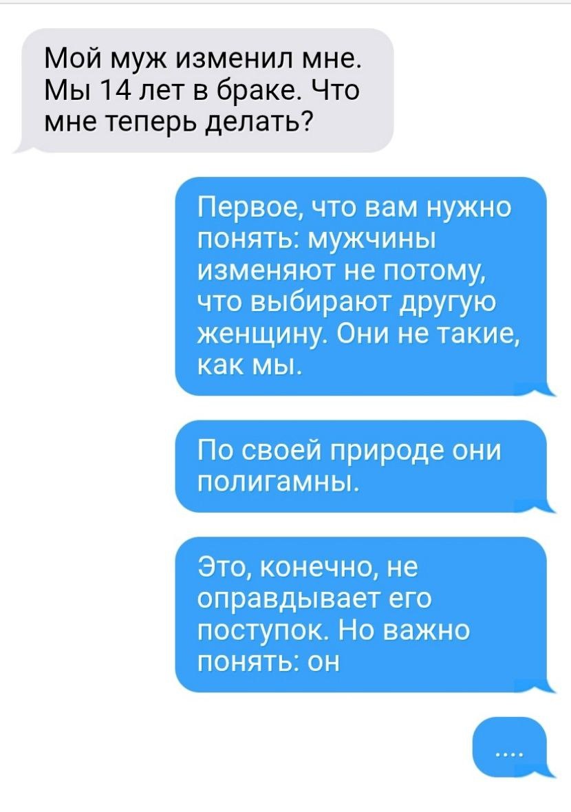 ❓«Мой муж изменил мне. Мы 14 лет в браке. Что мне теперь делать?» ❗Первое, что вам нужно понять: мужчины изменяют не потому, что выбирают другую женщину. Они не такие, как мы. По своей природе они полигамны. У них есть животная программа — оплодотворить как можно больше самок. Поэтому у них может возникать сильное желание. Это, конечно, не оправдывает его поступок. Но важно понять: он не сравнивал вас с ней. Вы можете быть для него очень ценны, и, при этом, он может захотеть другую женщину. Теперь главное — 🔥 решить, готовы ли вы с этим жить. По-настоящему принять этот факт и идти дальше. Или же он будет разъедать вас изнутри. Если вы готовы сохранить отношения, - стоит пойти к психологу. Проработайте и отпустите боль, снимите с себя чувство вины и самооценочные мысли. Очень может быть, что после этого кризиса ваш союз станет только крепче. Но если поймёте, что не можете простить, что это "слишком", то лучше разойтись. Не портить жизнь ни себе, ни ему. #вопрос #вопросответ #о