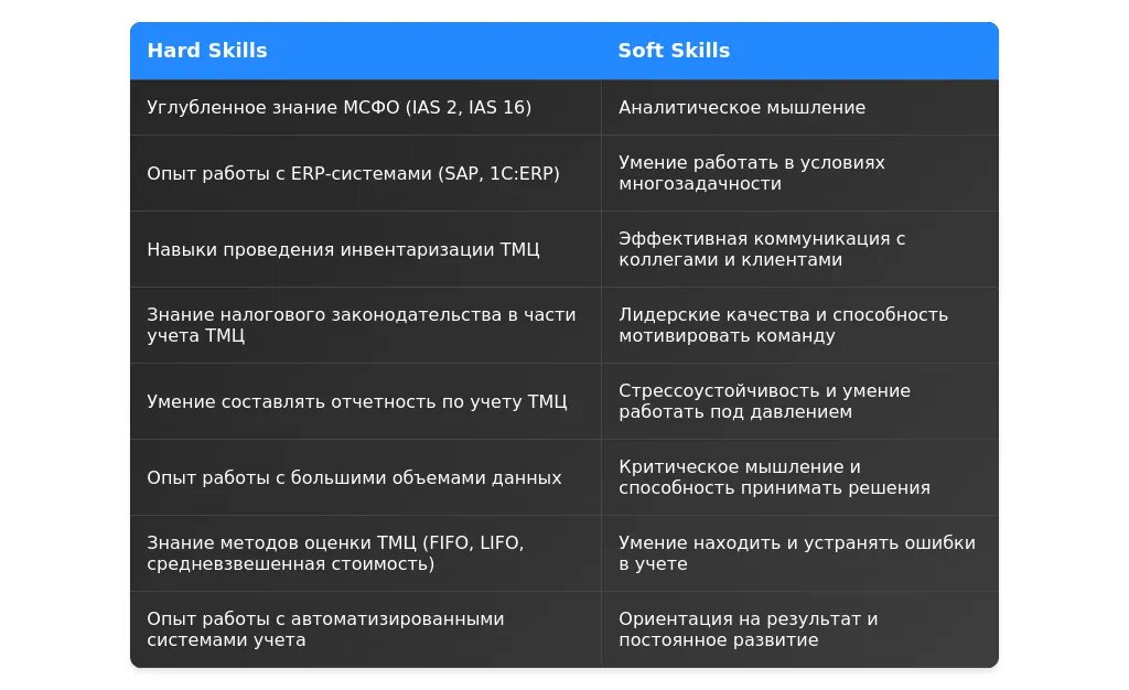 При анализе вакансии важно выделить ключевые требования, которые делятся на обязательные и желательные. Обязательные требования включают профессиональные навыки, такие как знание бухгалтерского учета ТМЦ, опыт работы с ERP-системами (например, 1С) и знание законодательства. Желательные требования могут включать дополнительные компетенции, например, опыт работы в крупных компаниях или знание международных стандартов учета.