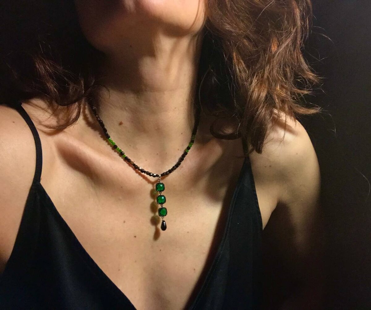 Вот такое украшение сделала и примерила. Люблю зелёные камни, даже если они простые кристаллы. Ну, а мое колье с чёрными агатами и диопсидом) Заказать украшения, обсудить детали можно по ссылке: @DiDi_Jewelry Di-Di