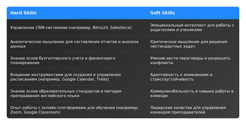 Soft skills — это личные качества, которые помогают эффективно взаимодействовать с людьми и решать задачи. Для администратора школы английского языка важны: