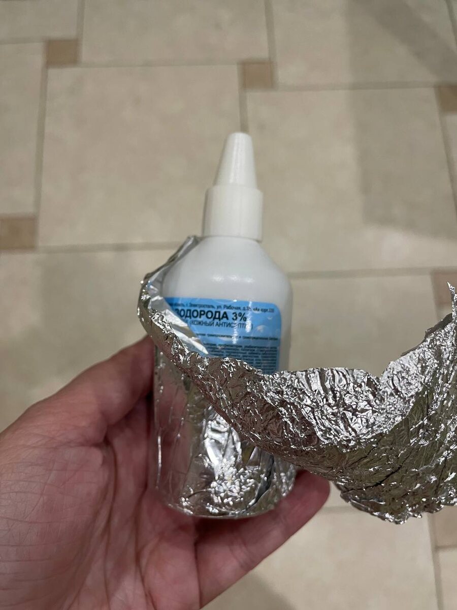 💡Кстати, а вы знали, что перекись необходимо хранить в темном месте, иначе она теряет свои свойства? Я придумала хранить свою перекись в фольге, потому что считаю, что заводской флакон пропускает достаточно дневного света и не обеспечивает сохранность.