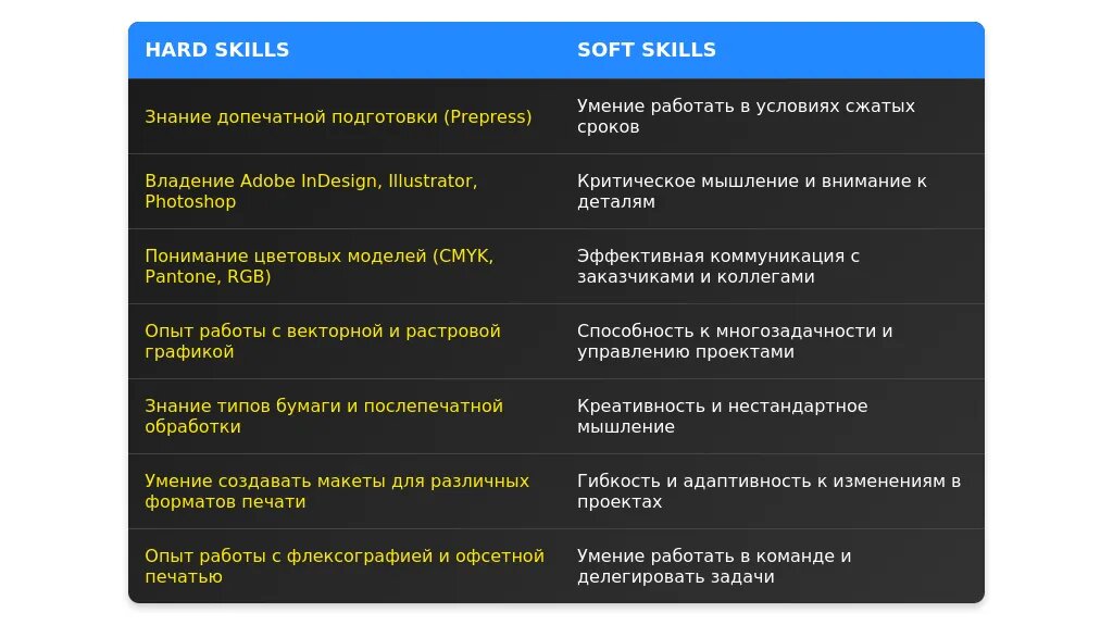 После адаптации: "Adobe Photoshop, Illustrator, InDesign, знание типографских стандартов, работа с препрессом."