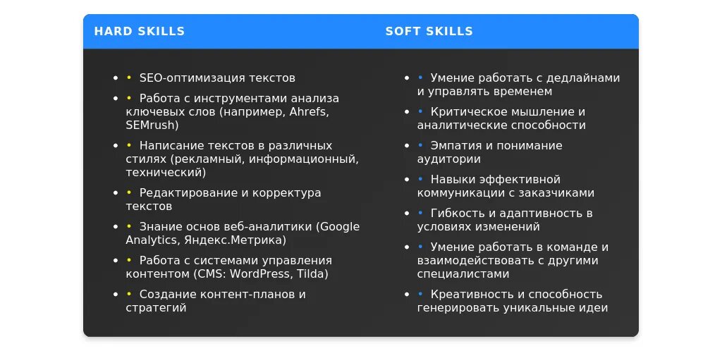 - Выделите уникальные компетенции, например, опыт работы с нишевыми темами.