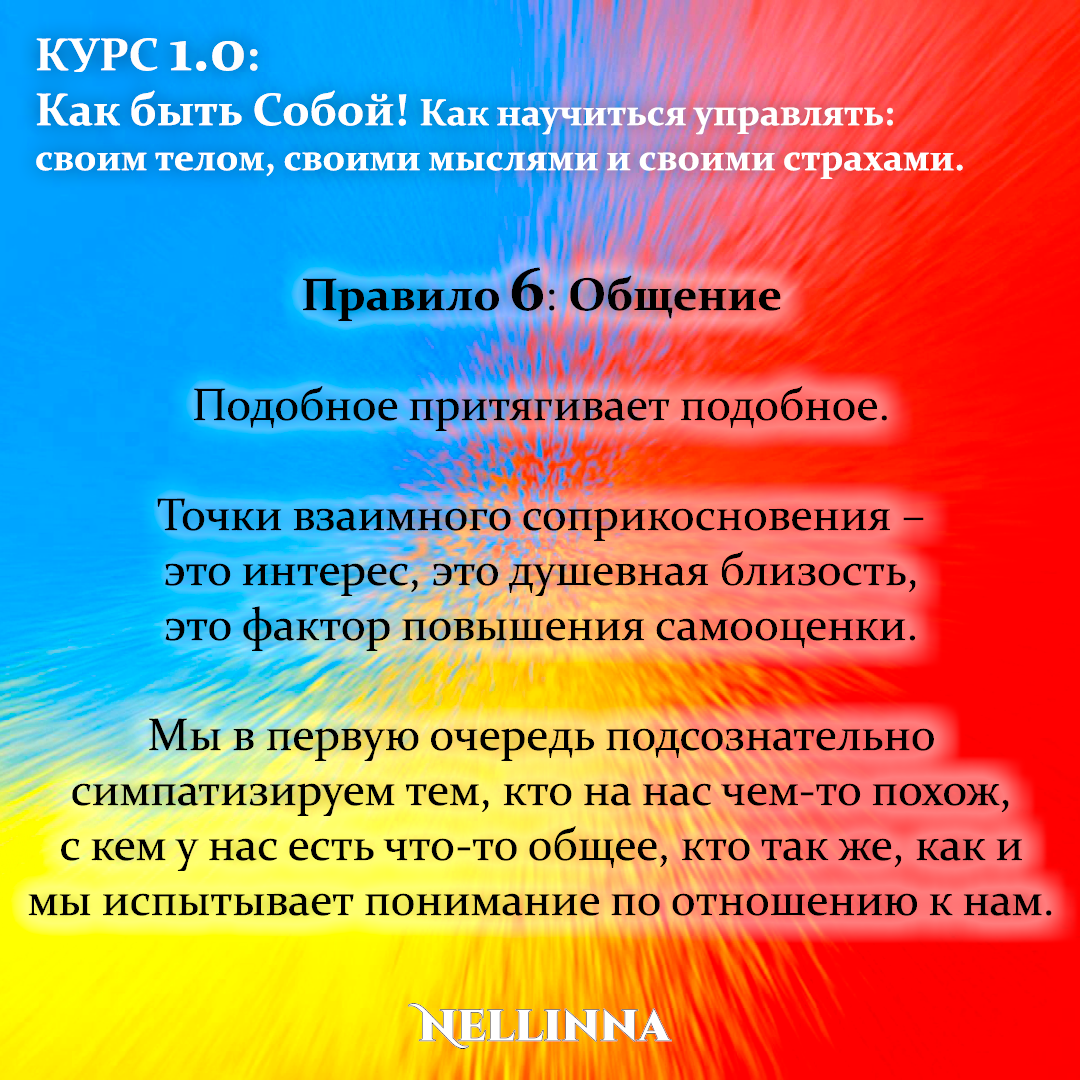 Правило 6: Общение Подобное притягивает подобное. Точки взаимного соприкосновения – это интерес, это душевная близость, это фактор повышения самооценки. Мы в первую очередь подсознательно симпатизируем тем, кто на нас чем-то похож, с кем у нас есть что-то общее, кто так же, как и мы испытывает понимание по отношению к нам. Ты когда-нибудь задумывался о том, какие люди нравятся тебе самому? К кому лежит душа, с кем тебе хочется общаться и кому ты легко можешь поверить и довериться? Подумай об этом на досуге, а потом постарайся понять, а каким людям нравишься Ты? Чтобы не пропустить следующую публикацию – Подписывайтесь! И делитесь полезной и бесплатной информацией! #курс #тренинг #обучение #практикум