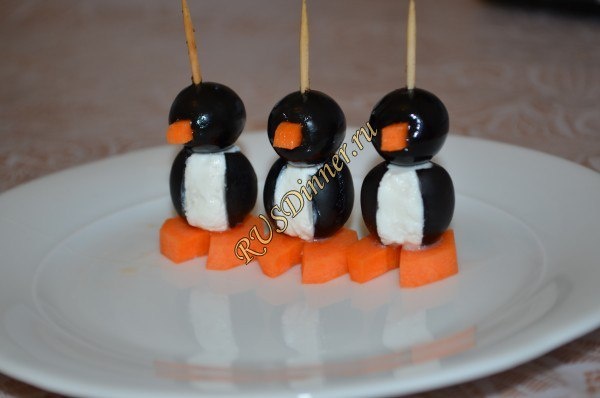 Канапе «Пингвины» От автора: Канапе «Пингвины» играют более развлекательный характер и выставляются на стол для украшения, но поверьте, их вкус Вашим гостям так же понравится как и вид. Как сделать пингвинов из маслин? Ингредиенты: Морковь - 20 гр. Зубочистки - 3 шт. Маслины консервированные - 1 б. (6 шт. без косточек) Сыр Фетаки - 20 гр. Источник: https://rusdinner.ru/page/kanape-pingviny