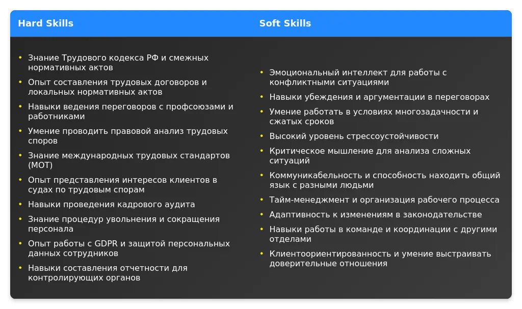 Навыки должны быть перегруппированы под требования вакансии. Выделите ключевые компетенции, такие как знание трудового законодательства, опыт ведения переговоров или знание иностранного языка.