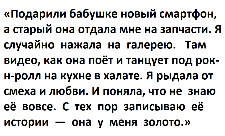 «Мама отдала мне свою сумку времён юности. Я её перебираю — и нахожу дневник. В нём стихи. И признания в любви к человеку с другой фамилией. Оказалось, до отца у неё был другой мужчина. Они расстались, но чувства остались. Поговорили. Мама сказала: "Это была моя весна, но с твоим отцом у меня лето. Солнечное".»
