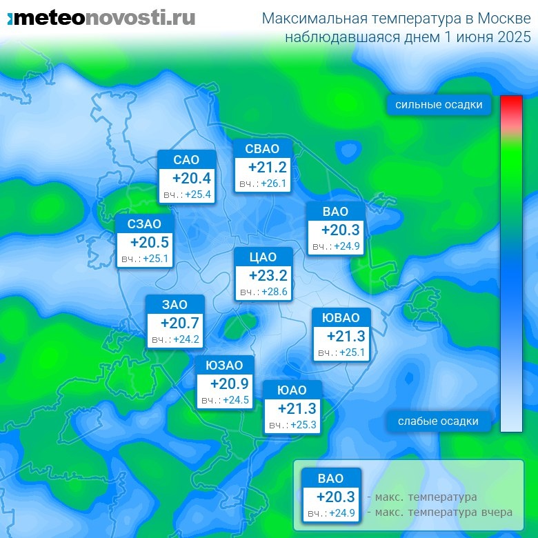 #за12часов #день Прошедший день 1 июня оказался на 4.5°C холоднее вчерашнего. Максимальная температура днём в Москве была всего на 0.1°C ниже нормы, что в пределах обычных значений. Самая высокая температура +23.2°C была зафиксирована в 13 часов в центре города, а холоднее всего было на востоке: +18.3°C. Разница по максимальной температуре в разных частях столицы составила за день целых 4.9°C. Максимальные порывы ветра днём достигали 11 м/с. Атмосферное давление за день повысилось с 744 до 746 мм.рт.ст. Повсеместно прошли небольшие осадки. Больше всего осадков выпало на юге города – 3.4 мм. Самый теплый день в Москве 1 июня был в 1921 году, когда максимальная температура составила +33.1°C, а холодный в 1881 году: +8°C. Перейти на сайт Прогноз погоды на 14 дней
