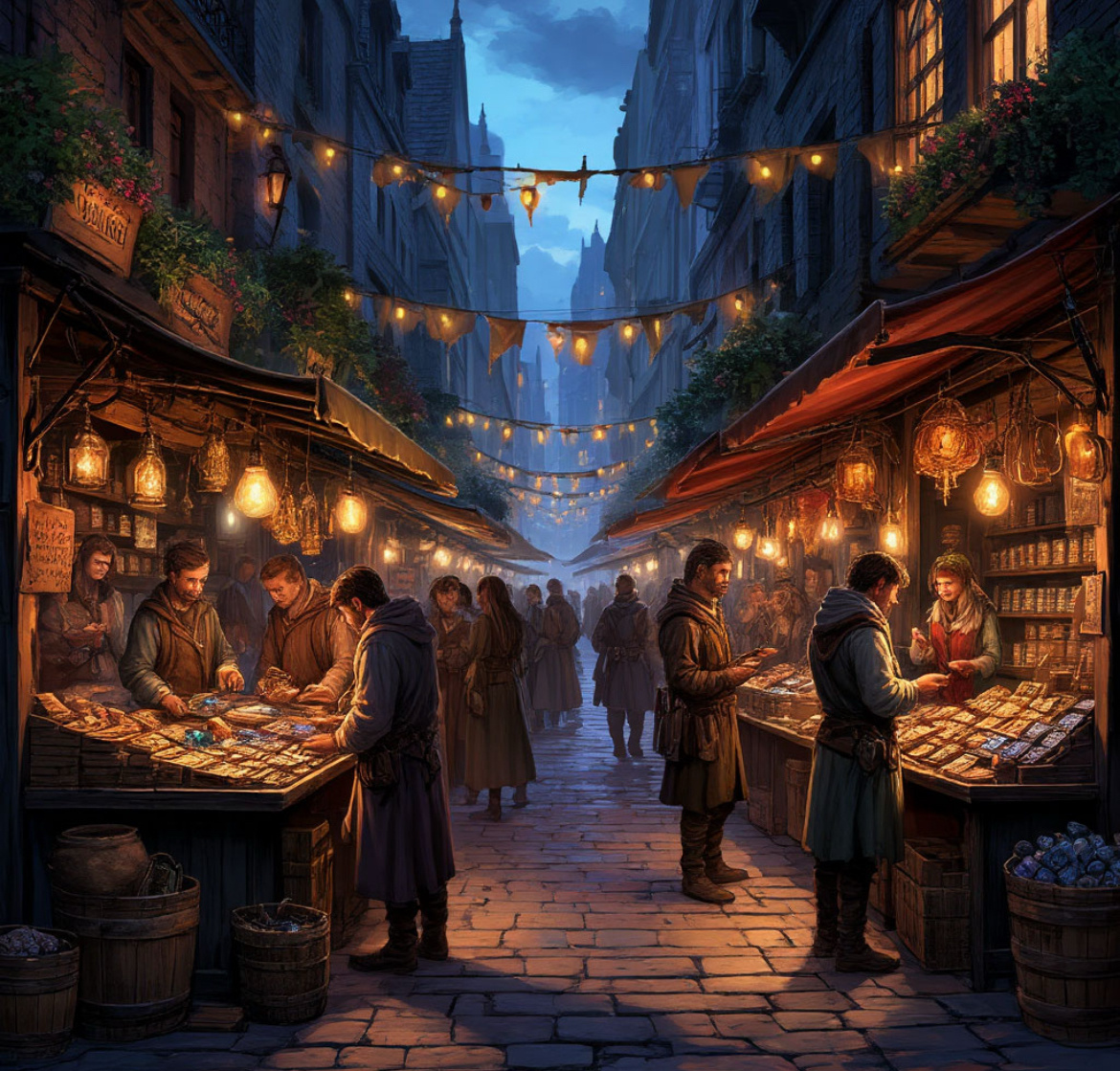 На Рынке Теней творилось свое, странное время. Казалось, полночь длилась вечно. Но когда первые петухи (хотя в городе их не было слышно десятилетиями) начинали петь где-то за гранью реальности, Рынок начинал меркнуть. Огни тускнели, голоса продавцов становились тише, как будто их заглушал нарастающий шелест крыльев невидимых мотыльков. Тени сгущались, поглощая ларьки.