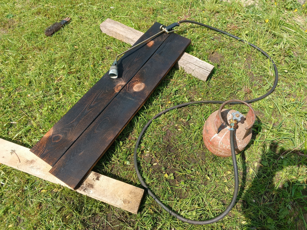Технология известна уже давно и, в принципе, не является большим открытием. Привлекательна своей простой, доступностью и красивым результатом. Термин браширование говорит, что процесс будет связан со "щетированием", то есть использованием щетки. И подвоха тут нет. Щётка и вправду один из ключевых инструментов. Брашировать буду сосну. Она самая распространённая и доступная по цене. Потребуется газовый балон. Объем зависит от количества материала. Для примера, на пятнадцать штук дюймовки 25*150*6000 и пять штук 25*100*6000 у меня ушло полтора баллона на 5л. Газовый баллон у меня уже был. Оставалось заправить его на станции. Точнее обменять. Стоимость обмена 250 руб. Включаю газовую горелку. Начинаю обжигать поверхность досок. Можно по одной: для пробы. А лучше попробовать сложить несколько штук в ряд. Так получится большая площадь для обработки, что повысит скорость работы. Для обжига также подойдёт бытовая пьезогрелка. Только придется запастись терпением. Производительность у нее сл