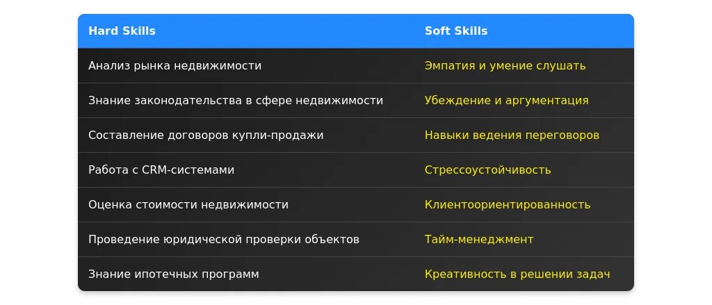 После адаптации: "Навыки работы с CRM-системами, ведение переговоров с VIP-клиентами, знание законодательства в сфере недвижимости."