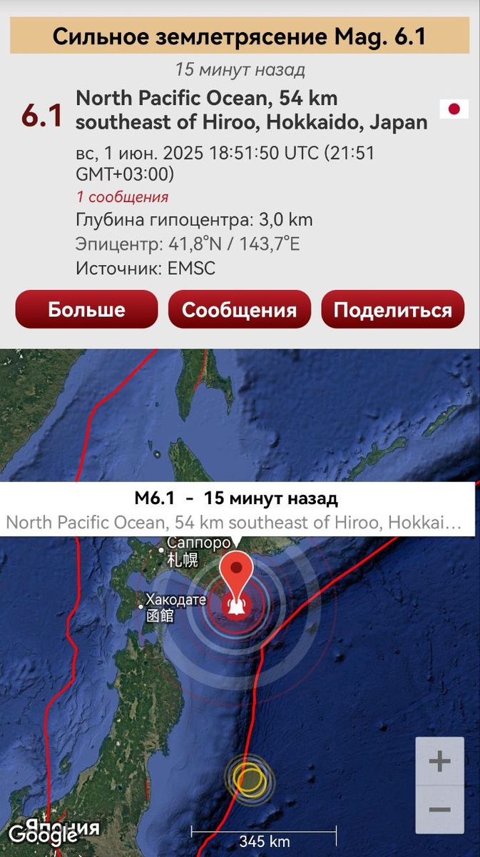 В ответ на пост Согласно сегодняшнему предупреждению произошло еще одно сильное землетрясение М6.1 у Хоккайдо. На финал не похоже, у Японии или южных Курил возможна более сильная сейсмика (М7+) в течение 9 дней. ==== According to today's warning, another strong M6.1 earthquake has occurred near Hokkaido. It doesn't look like the final, Japan or the southern Kuril Islands may have stronger seismic activity (M7+) for 9 days.