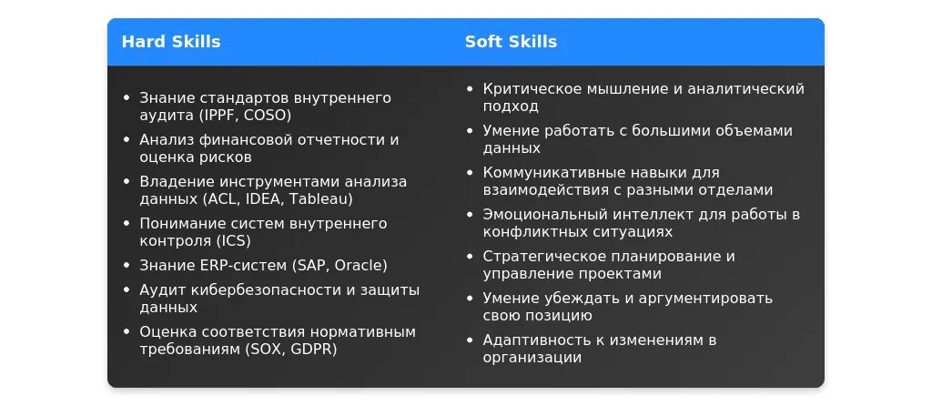 После: Знание международных стандартов аудита (IPPF, COSO).