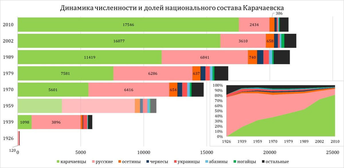 Этносостав городов. Карачаевск Если в Черкесске распад СССР характеризуется ростом всех кавказских народов и сокращением почти всех остальных, то Карачаевск воспринимается как город для карачаевцев и к 2002 г. там фиксируется сокращение всех кроме них (ну и ногайцев, которых в городе было довольно немного). Русских стало почти в два раза меньше. К 2010 мы вновь видим некоторое ослабление предыдущего тренда, и даже сокращение общей численности. Русских стало ещё меньше на треть, ещё сильнее упала доля остальных кавказских народов, что особо заметно на примере осетин. (@kaptomaht)