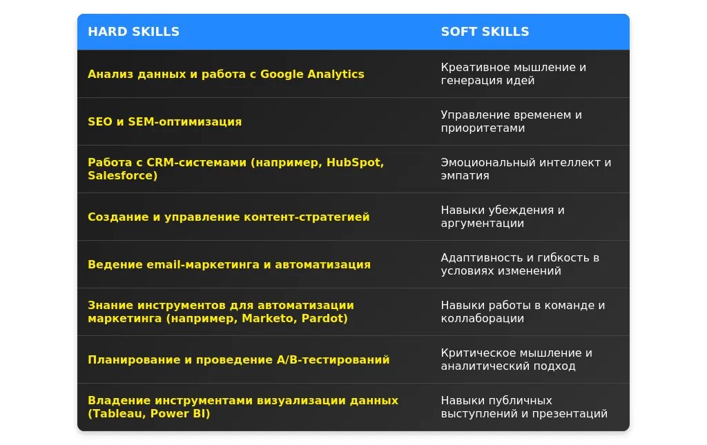 "Навыки: маркетинг, коммуникации, аналитика."