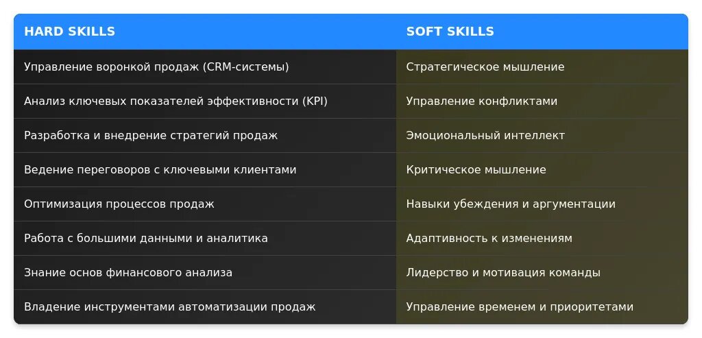 - Личные качества (Soft Skills): лидерство, коммуникация, стратегическое мышление.