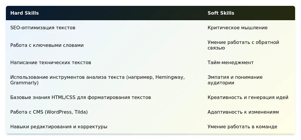 Ключевые навыки (например, работа с текстами, грамотность, знание основ маркетинга).
