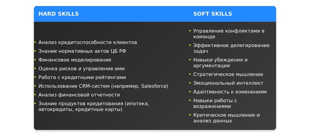 После: "Навыки работы с корпоративными клиентами, анализ кредитных рисков, знание программы 1С:Кредит."