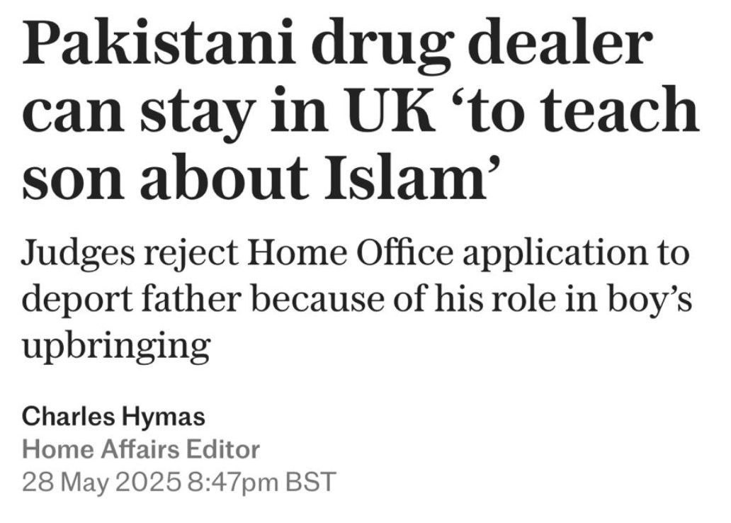 Суд Великобритании отказался депортировать наркодилера из Пакистана, так как ему надо учить сына исламу. @nemediatema