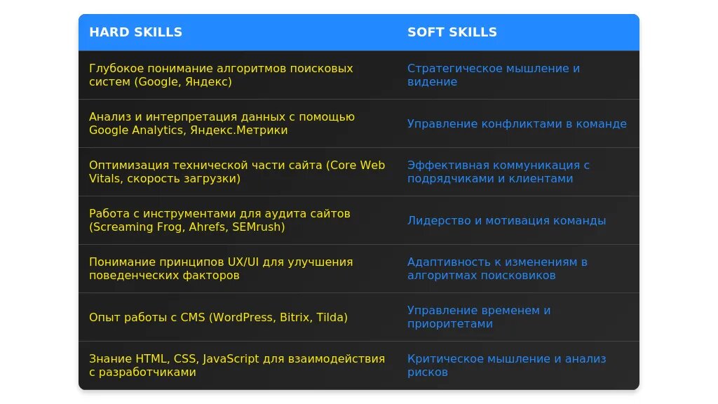 - Делайте упор на базовые технические навыки (SEO, аналитика).