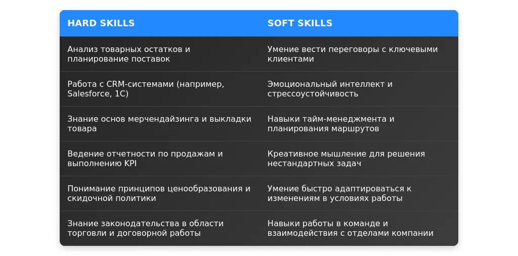 "Навыки ведения переговоров, работа с CRM-системами (Salesforce, 1С), знание рынка FMCG".