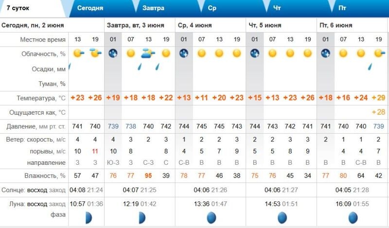 ☀️ В Красноярский край вернулось тепло Сегодня, 2 июня, днём воздух прогреется до +23, малооблачно и без осадков, ветер западный 4-11 м/с. Во вторник ночью ночью +19, днём на один градус холоднее и +18, облачно с прояснениями и небольшой дождь, ветер северный 3-8 м/с. В среду ночная температура воздуха составит +13, дневная достигнет +20, ясно, без осадков, ветер восточный 3-9 м/с. В четверг и пятницу в тёмное время суток от +15 до +18, в светлое не ниже +24, ясно, без осадков, к вечеру последнего рабочего дня недели +29 и слабый дождь, ветер восточный 3-9 м/с.