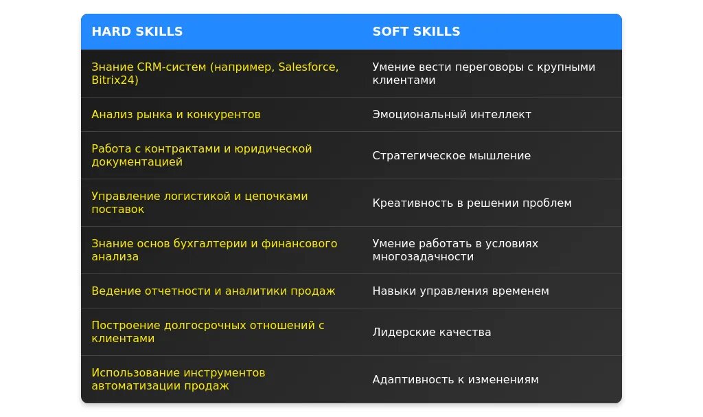 Навыки нужно перегруппировать, чтобы они соответствовали вакансии. Выделите ключевые компетенции, такие как "ведение переговоров", "работа с CRM" или "управление ключевыми клиентами". Используйте ключевые слова из описания вакансии.
